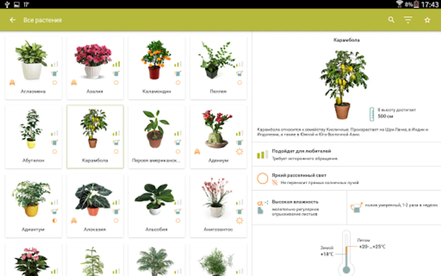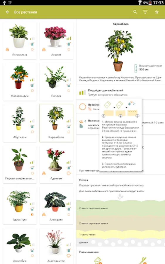 Handbook for home care of plants has never been so easy. We have worked out the design in such a way that you do not have to wade through a long string of text to find out how often you need to water your pet window as needed sunlight and how to propagate plants. All information is presented in an easy graphical format with a minimum of text. Just look at the screen and you will not have problems.