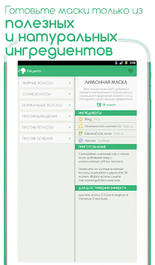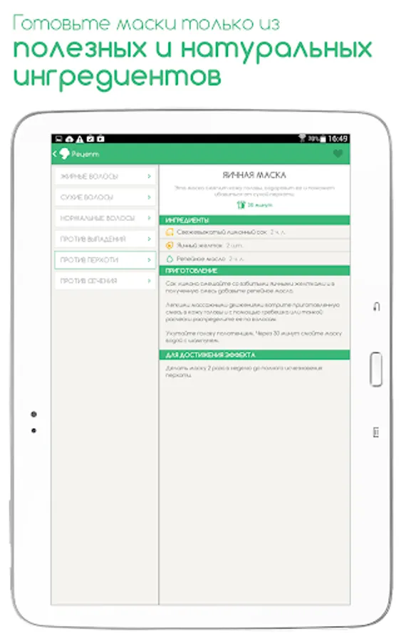 We know that your time is valuable to you and therefore all the masks decorated with an emphasis on simplicity and ease of use. Recipes are divided into smart section where clearly defined the necessary ingredients, while holding the mask, the regularity of the application - by following these simple steps you will achieve the desired result.