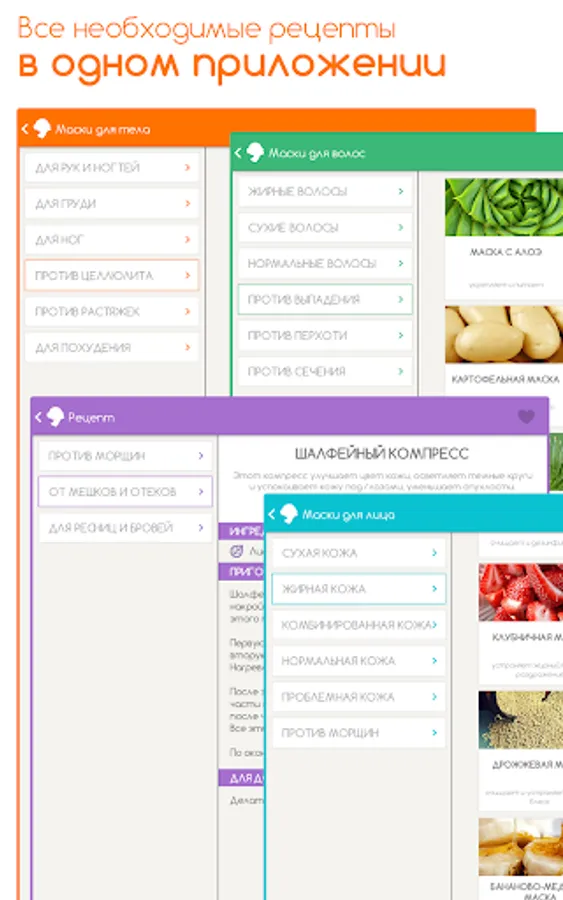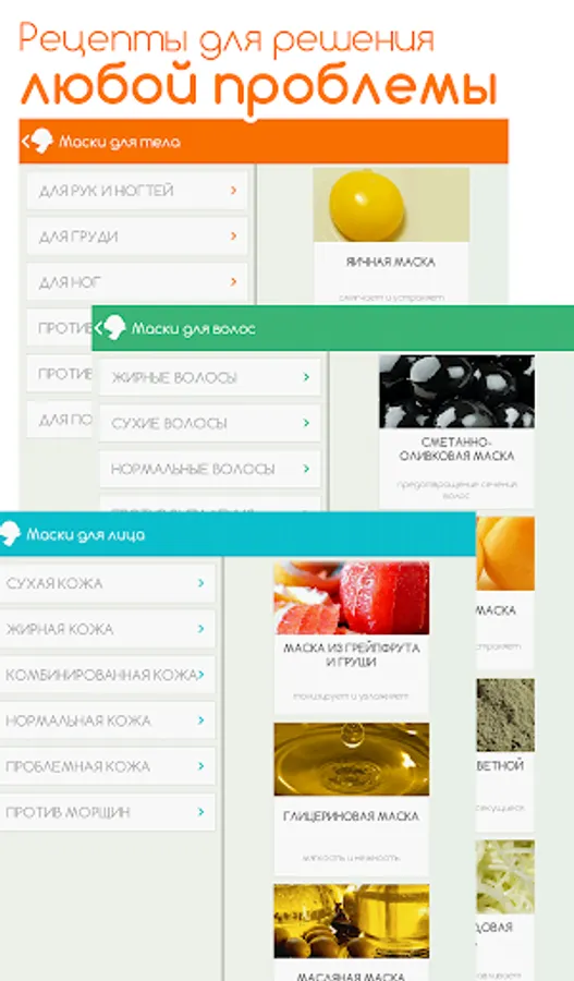 All the ingredients, preparation and application of the elements in our recipes are chosen exclusively from the point of view of the maximum benefit for certain types of skin, hair, and for the most common problems of modern women. The composition of each mask contains only natural ingredients, which you can get directly from the refrigerator at home or in the grocery store.