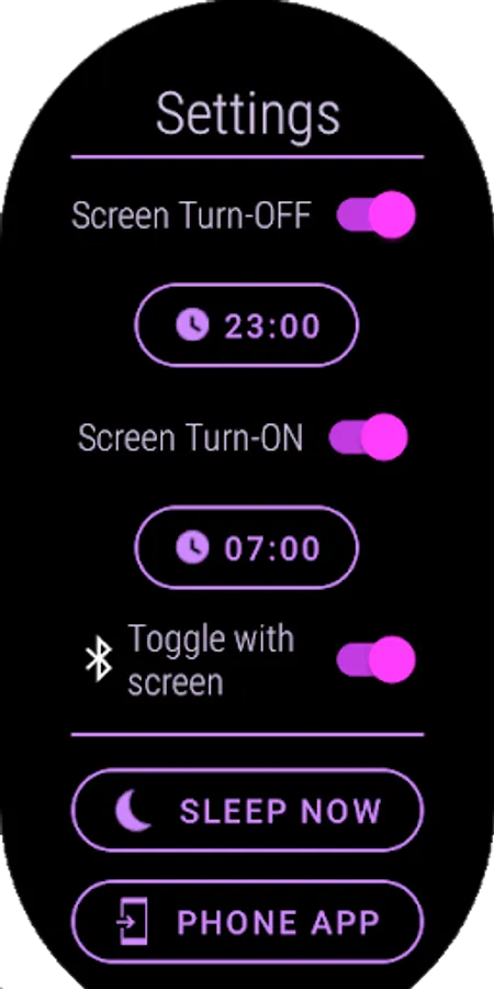 This small app intended to solve all these problems by allowing you to set the time when screen will be automatically turned off (when you go to bed) and turned back on again (before your alarm).