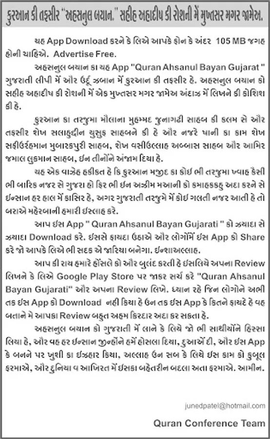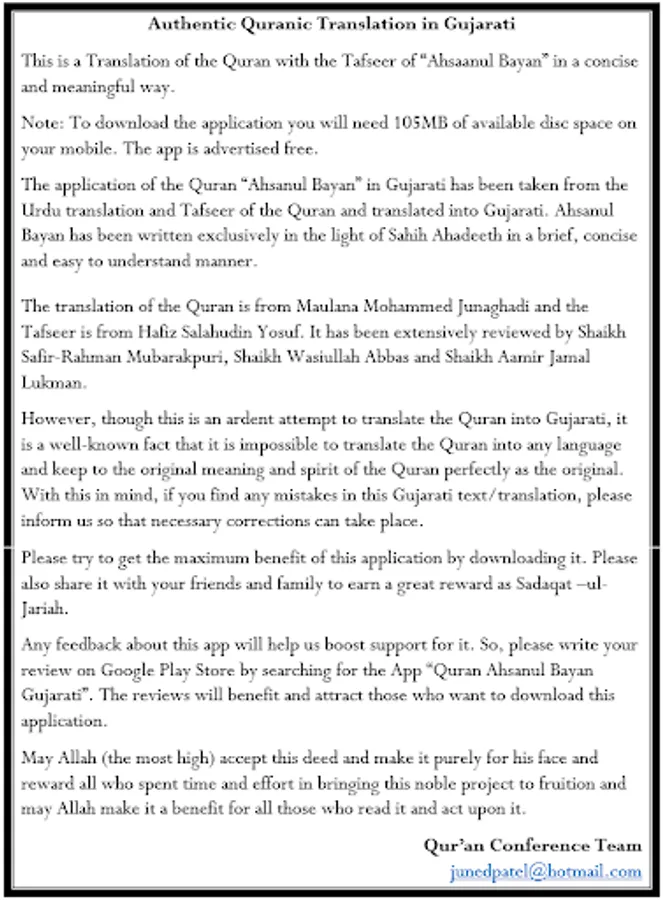 અહસનુલ-બયાન કા યહ App "Quran 'Ahsanul Bayan' Gujarati" ગુજરાતી લિપી મેં ઓર ઉર્દુ ઝબાનમેં કુરઆનકી તફસીર હે. અહસનુલ-બયાન કો સહીહ અહાદીષ કી રોશની મેં એક મુખ્તસર મગર જામેઅ અંદાઝ મેં લિખનેકી કોશિશ કી હે.