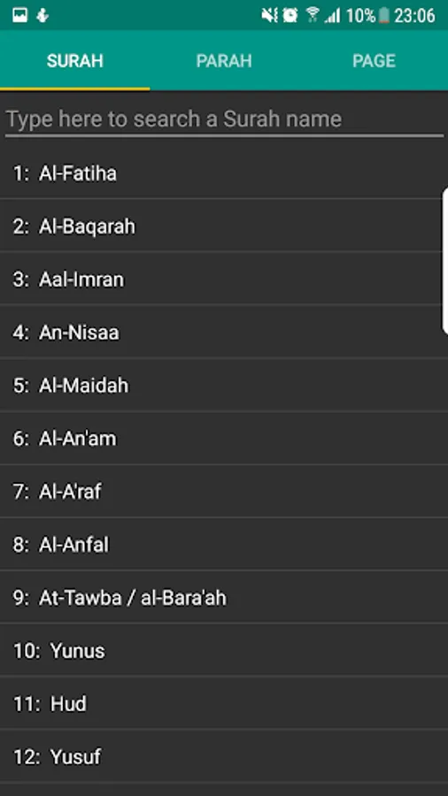- Search functionality for Surah names