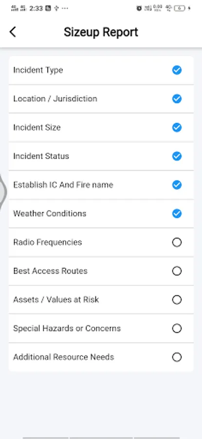 - Checklists. Selectable checklists for common and crucial radio traffic, such as sizeup reports and medical incident reports (8-lines). Check the button next to each topic you hit as you radio in. Remember, it's push to talk, not push to think.