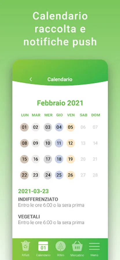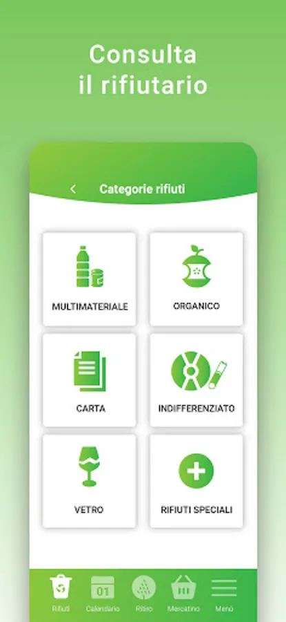 - easily consult, thanks to the interface organized by categories, the daily calendar with all the information relating to the collection and, with the waste search engine, identify the category in which to throw the different materials;