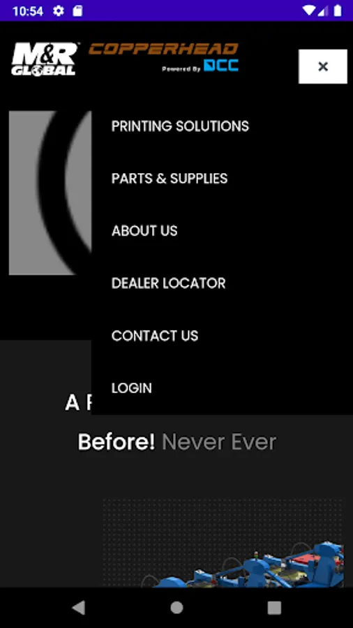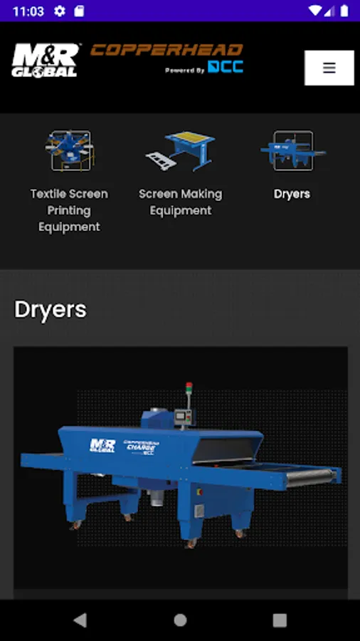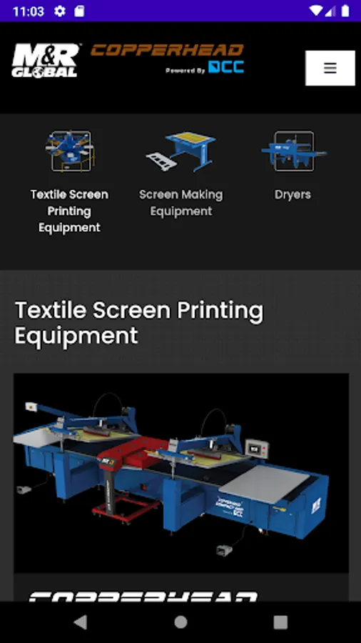 App to view M&R Global Copperhead powered by DCC Screen Printing machine, accessories and applications.
