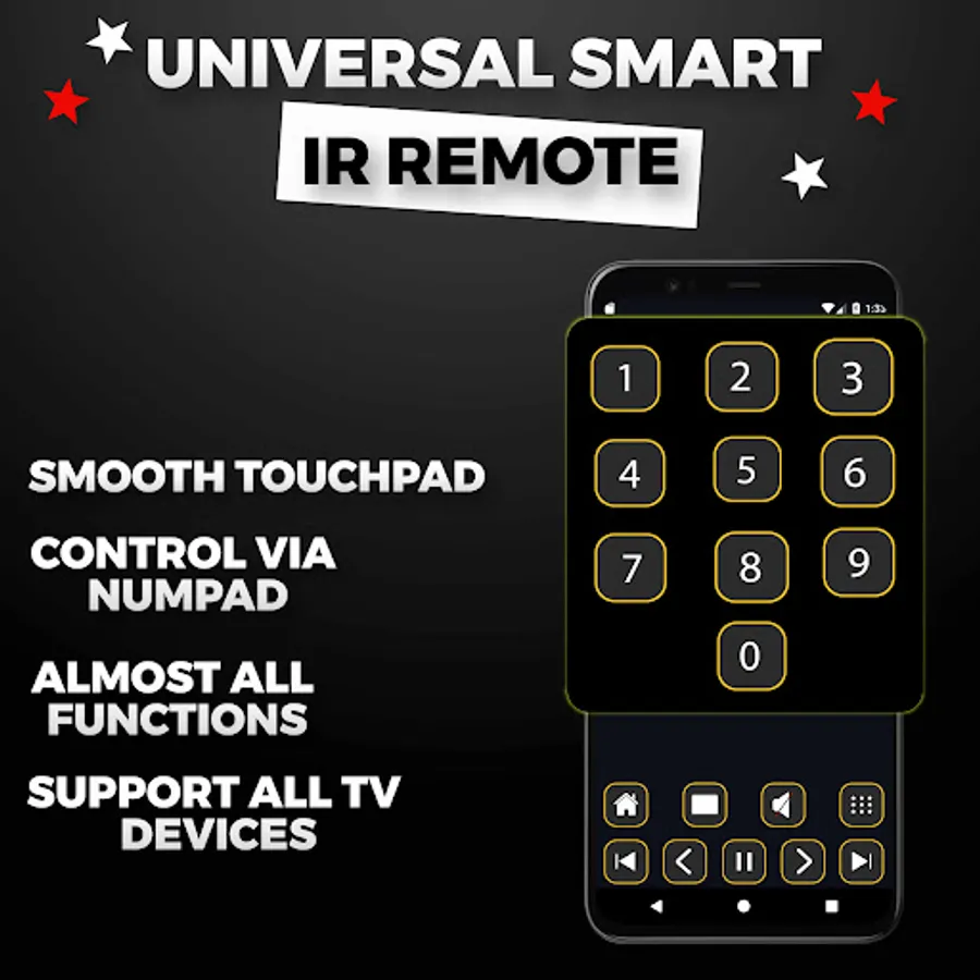 This app was created to be the all-in-one tv remote control for all tv. Meaning you can use it as remote control for Smart tv, IR tv remote, and a smart remote control for all tv. Control your IR tv device from your phone using ir blaster. This remote control is simple, complete and ergonomic. With this TV remote app, you are able to easily control TV channels, apps and menus from phone to TV in few taps! And never worry about losing your physical remote or running out of battery. For IR TVs, your phone must have a built-in Infrared (IR) feature for the app to work as a remote control. Our smart remote control can connects to your TV through wifi or infrared technology. It can also be connected through Bluetooth for easy and convenient control. The IR feature is required to send signals from your phone to the TV set just like a normal TV remote. Turn your mobile device into a remote Control over built in infrared blaster. No setup required. Just open IR remote application and TV, and start using it by selecting the desire name. All television remote control app has the feature to connect through IR mode so no worry about ir feature. If you are a TV enthusiast who always forget where your remotes are, this remote for all TV app will help you a lot. Remote Control for Android TV will transform your Android smartphone into a complete TV remote. This is the perfect universal remote that can easily connect to all type of tv's easily with just one tap. One Android TV Smart TV application can control different TVs with your smartphone. Universal Smart TV Remote Control operates using a Wireless network or Infrared (IR Blaster) from your device for controlling each and every function of your television. Now you don't need to worry run out battery of direct TV remote, it's time to download this universal remote control for TV!