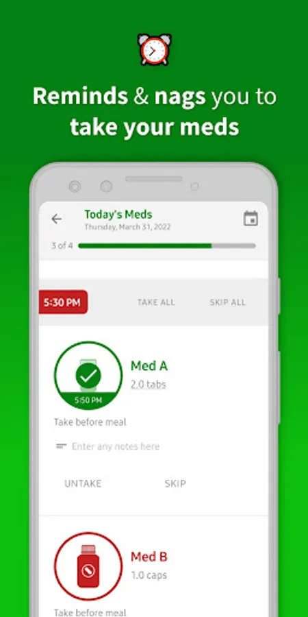 • Smart reminder: when you mark your next meds as taken or skipped, the med alert will be silent - and you'll have a quiet sleep!