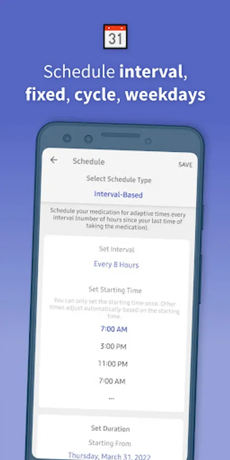 Every interval (Flexible) schedule to take your medication an interval after your last time of taking the dose. You set the interval (number of hours) and starting date & time.