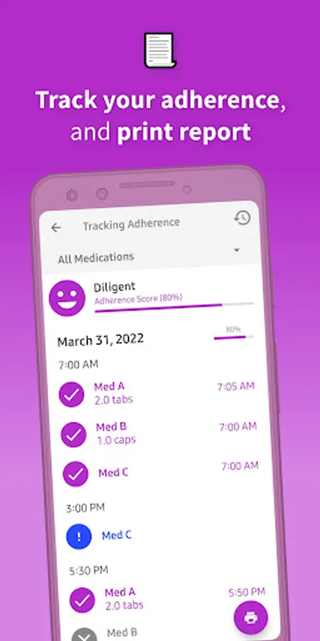 • Adherence score: view your day progress as you take, skip, or miss doses.