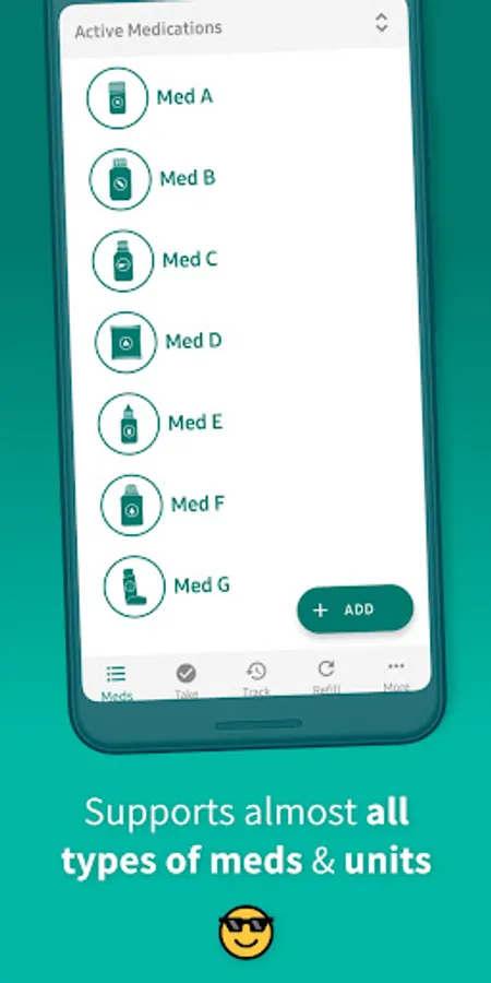• Supports 17 types of medications with stunning graphics: Tablet, Capsule, Syrup, Injection, Powder, Drops, etc.