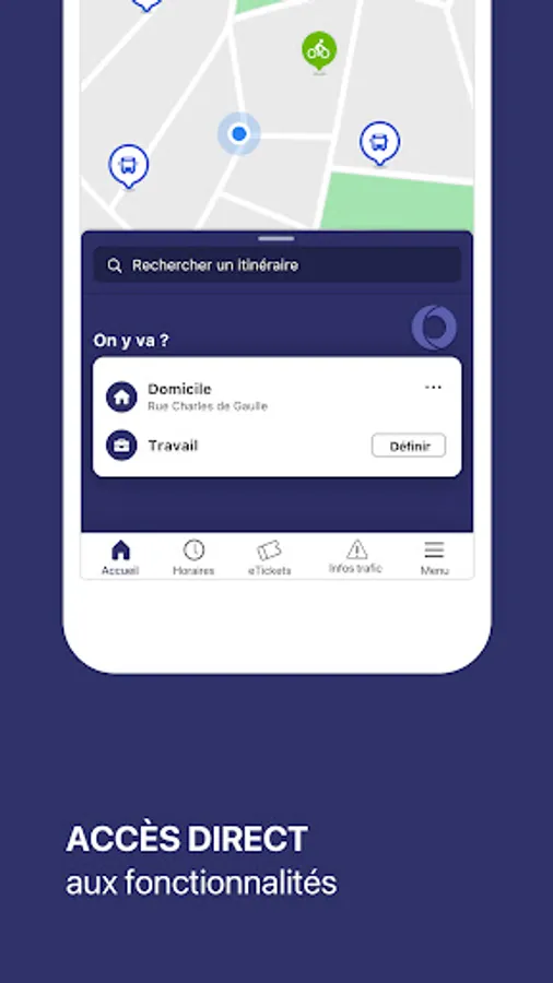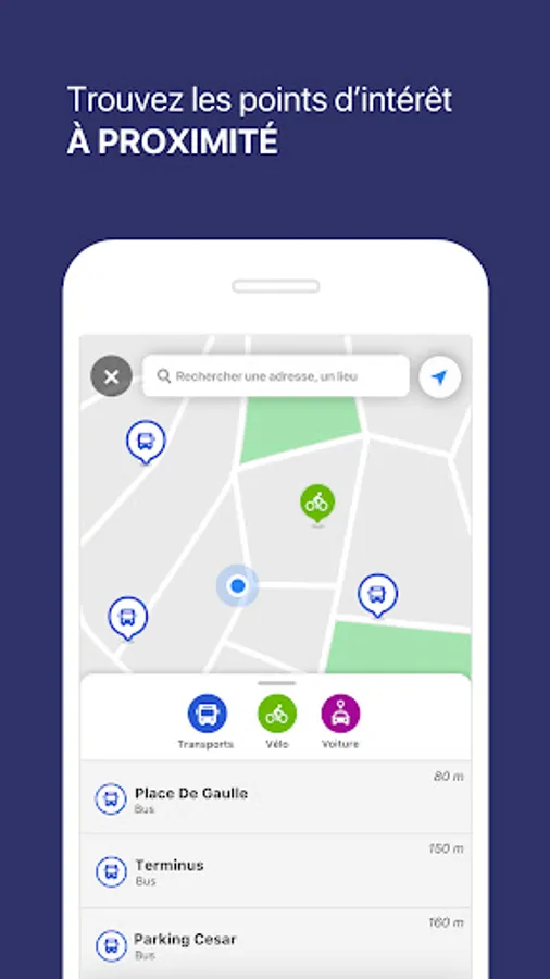 The "around me" feature offers you the best mobility solutions nearby, such as the nearest bus stops and their next departures in real time, stops for spontaneous carpooling lines, secure hoops and boxes for bicycles, and as the possibility of reserving a Vélodéa in a few clicks, the position of Citiz cars in car-sharing but also the relay points selling transport tickets.