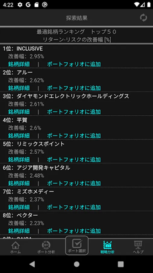 Automatically extract the most suitable stock for the current portfolio based on price fluctuation information. With filter function by PER, PBR, market capitalization, ROE, ROA, capital adequacy ratio