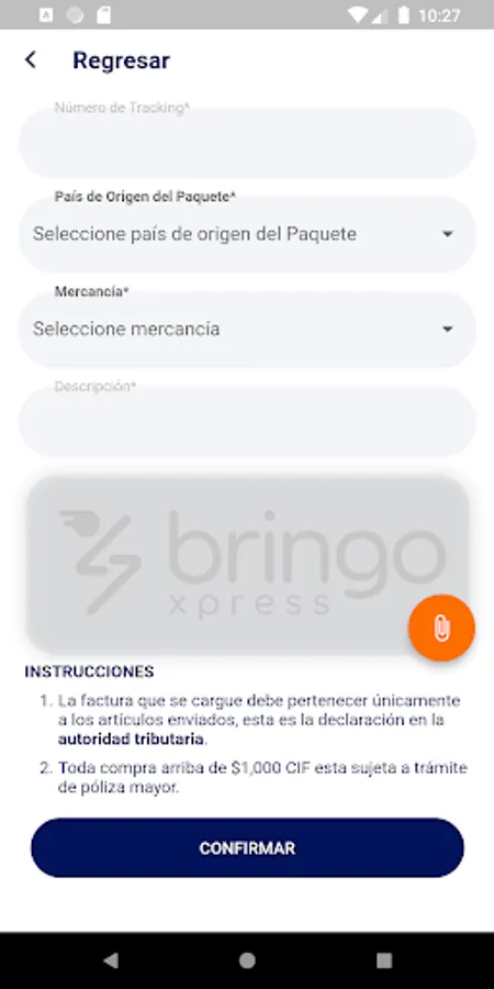Manage your shipments with Bringo Xpress, the application allows you to pre-alert your shipments, upload your invoices, track your packages, make your payments, manage your addresses and view your balances in the same way as in the customer portal.