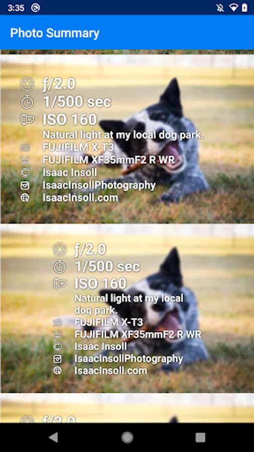 Photo Summary allows you to quickly and easily create beautiful images containing the camera settings used to take the photo.
