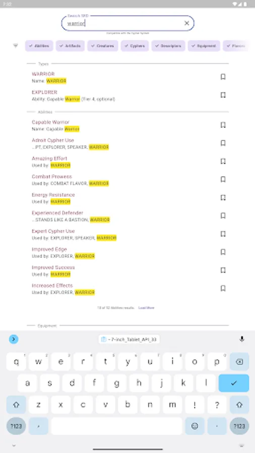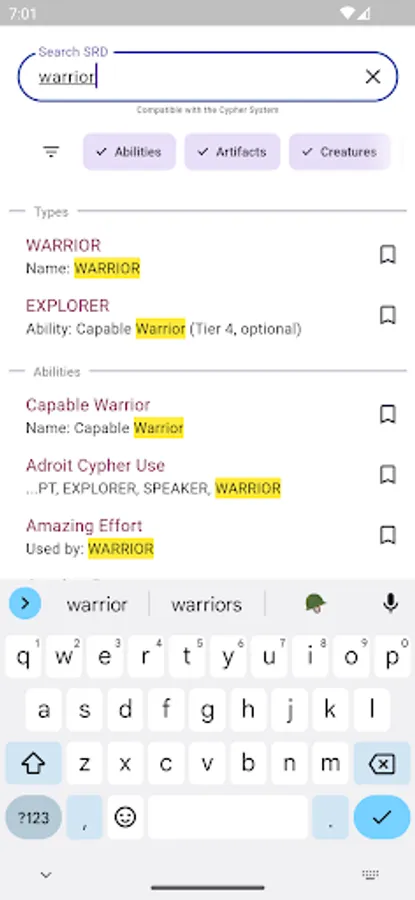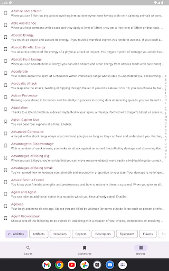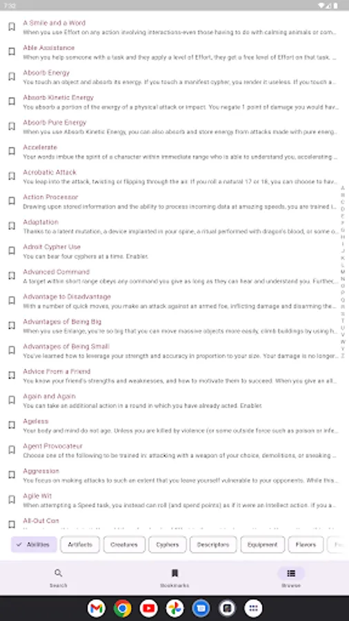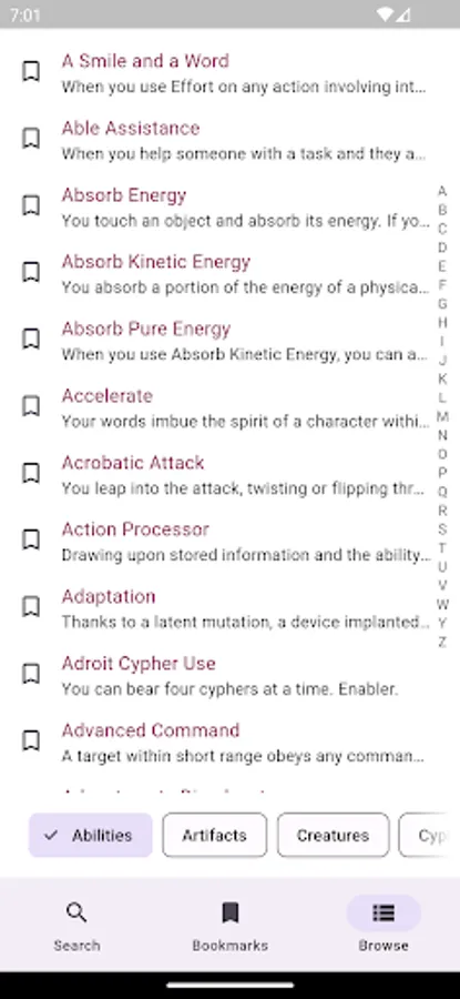 - Look up all SRD Abilities, Types, Foci, Descriptors, Cyphers, Creatures, and more
