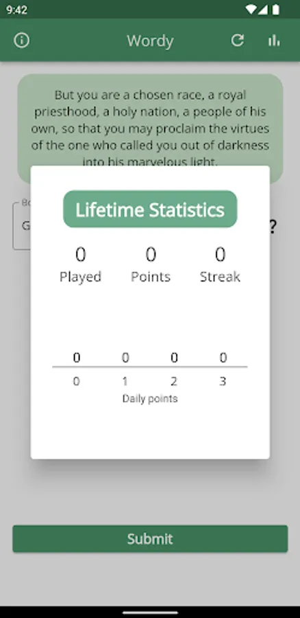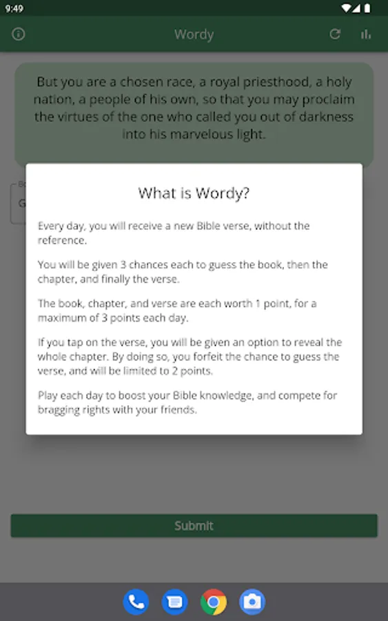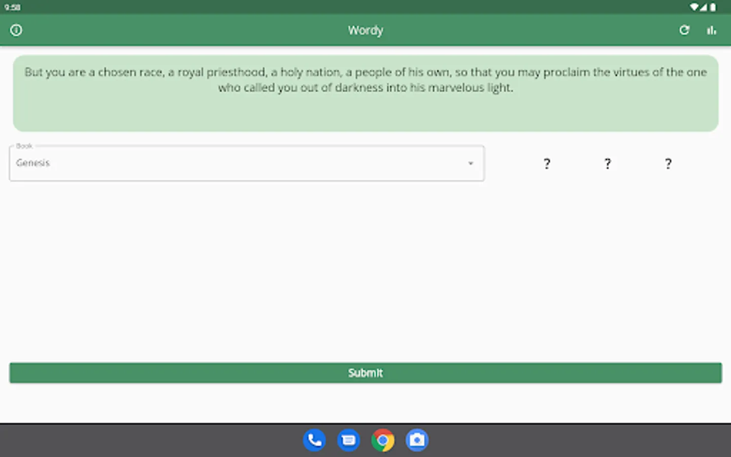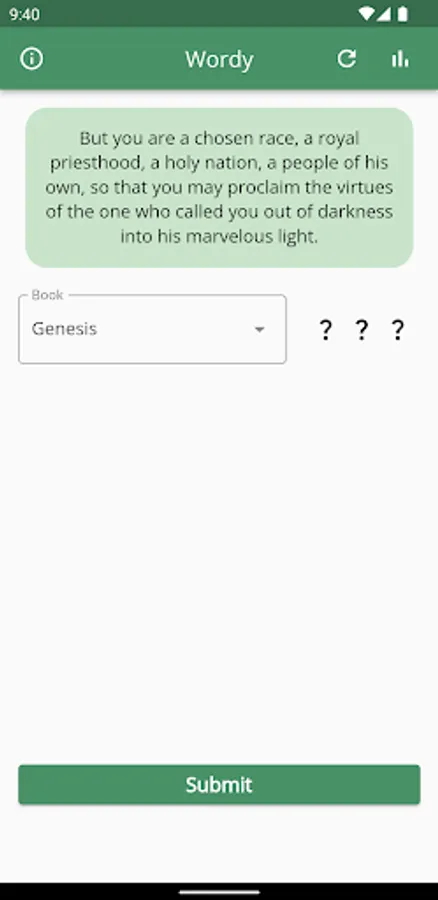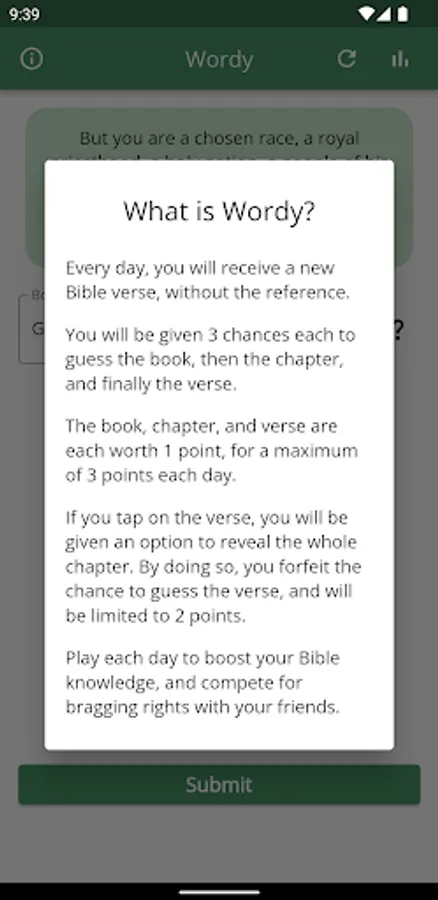 Learn new verse references, get a new verse each day. Each day you'll get a new verse without the reference. You'll get three chances to guess the book, then three guesses for the chapter, and finally three guesses for the verse. You can earn up to 3 points each day.