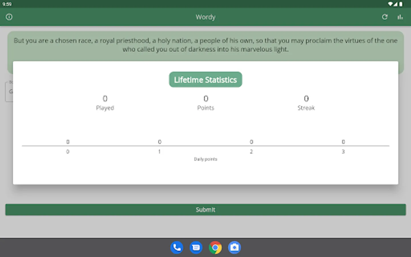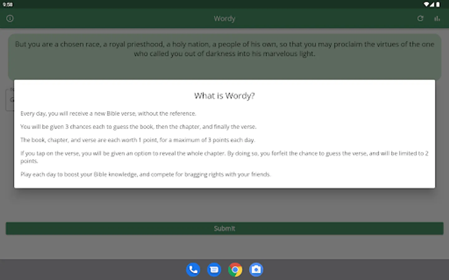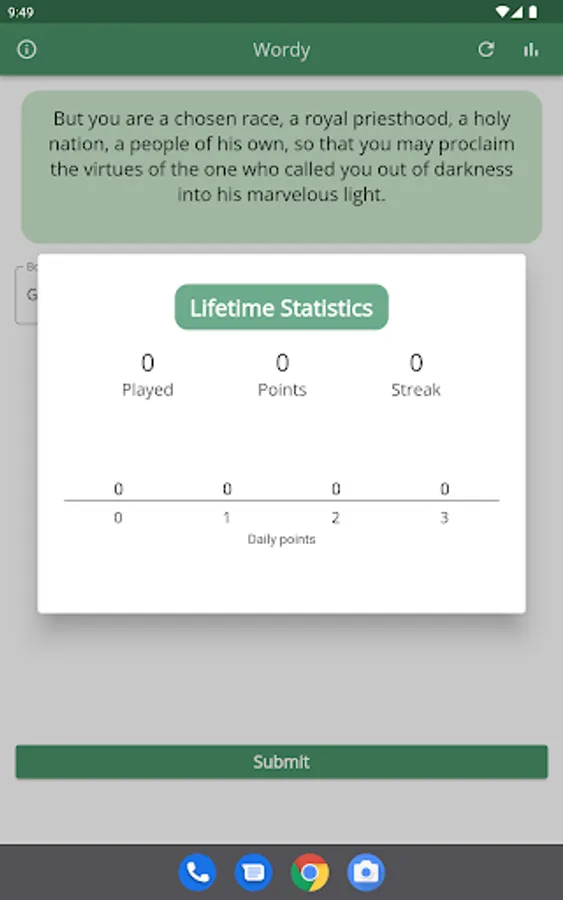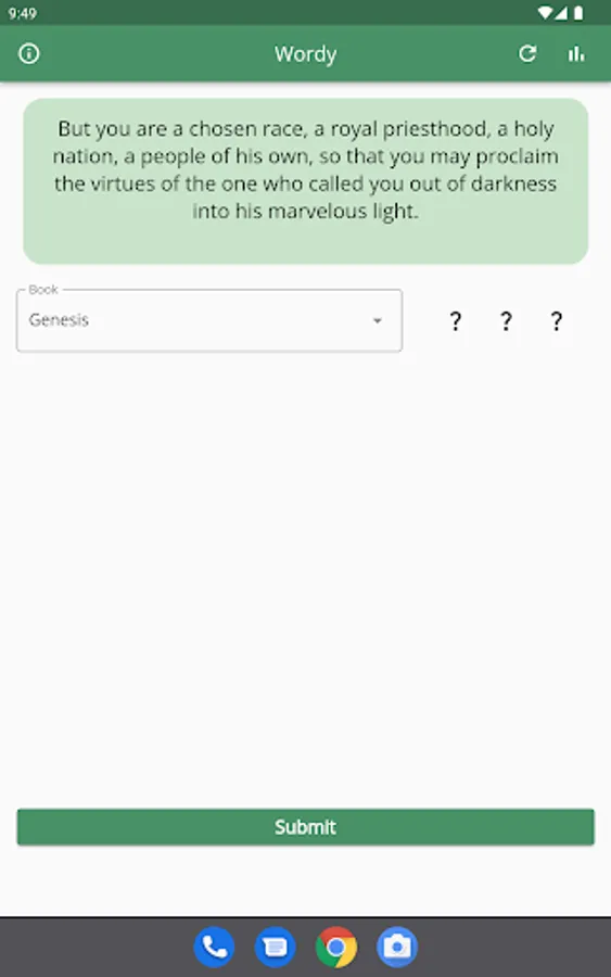 Learn new verse references, get a new verse each day. Each day you'll get a new verse without the reference. You'll get three chances to guess the book, then three guesses for the chapter, and finally three guesses for the verse. You can earn up to 3 points each day.