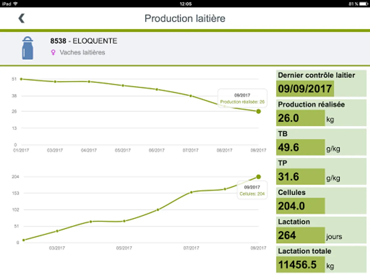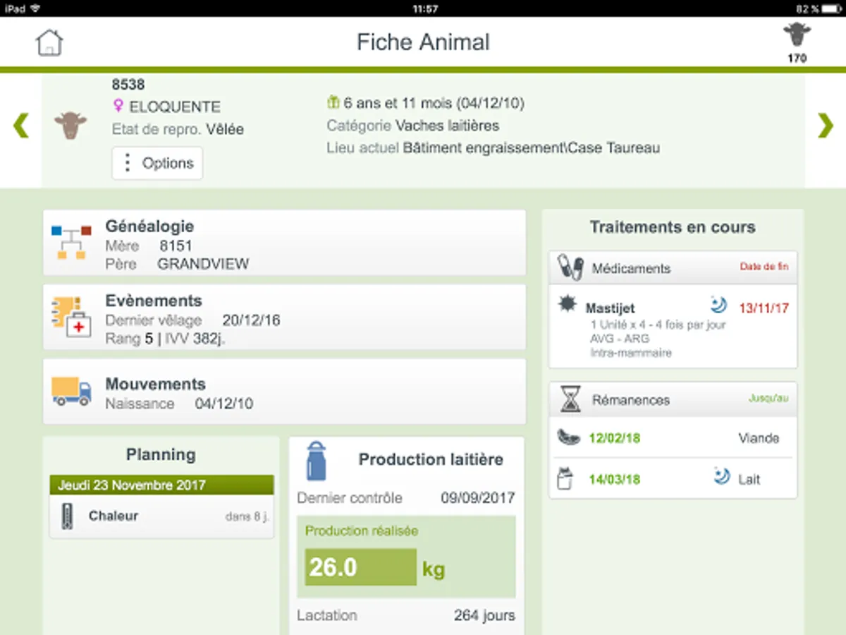 - Accès à une Fiche Animal détaillée avec les résultats et historiques de chaque animal (généalogie, évènements de reproduction et sanitaires, dernière pesée et GMQ, mouvements, planning, traitements en cours, données de production laitière)