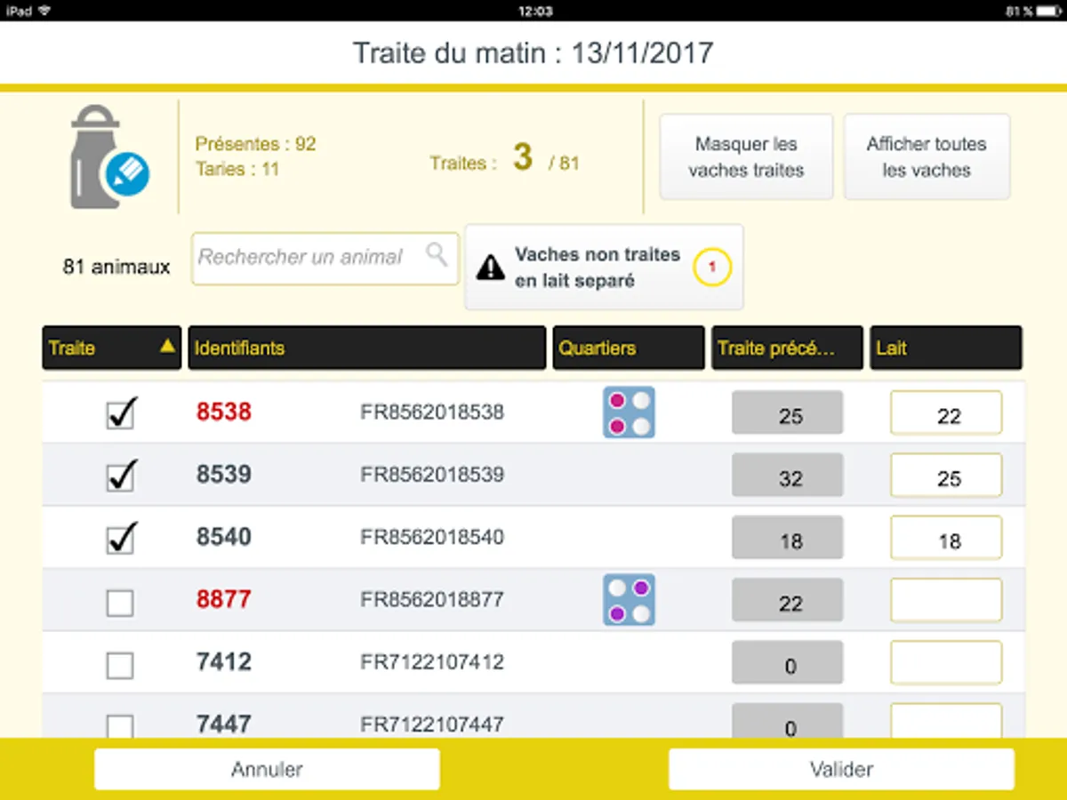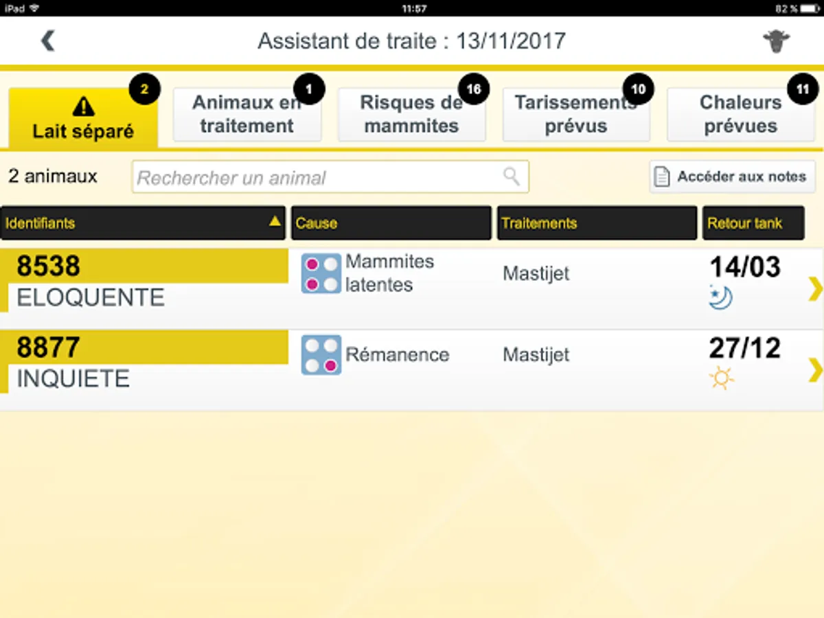 - L’assistant de Traite : Affichage des vaches en alertes (lait écarté du tank, traitements sanitaires en cours, rémanences et planning de reproduction) et saisie du contrôle laitier