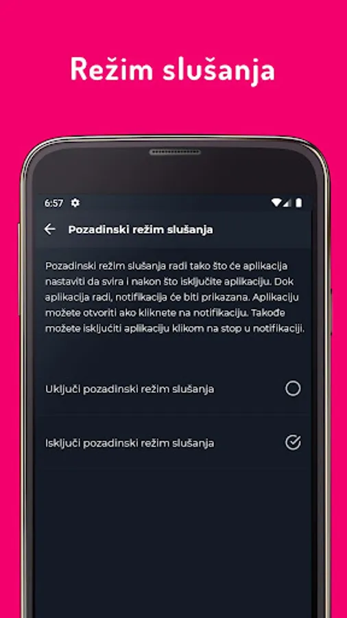You can select the option to turn off the radio together with closing the application (which is the default option), or to allow the radio station to be interrupted even though you switch off the application. In either case, a notification will appear through which you can switch off or pause the current radio station. Listen notification appears even when your phone screen is locked.