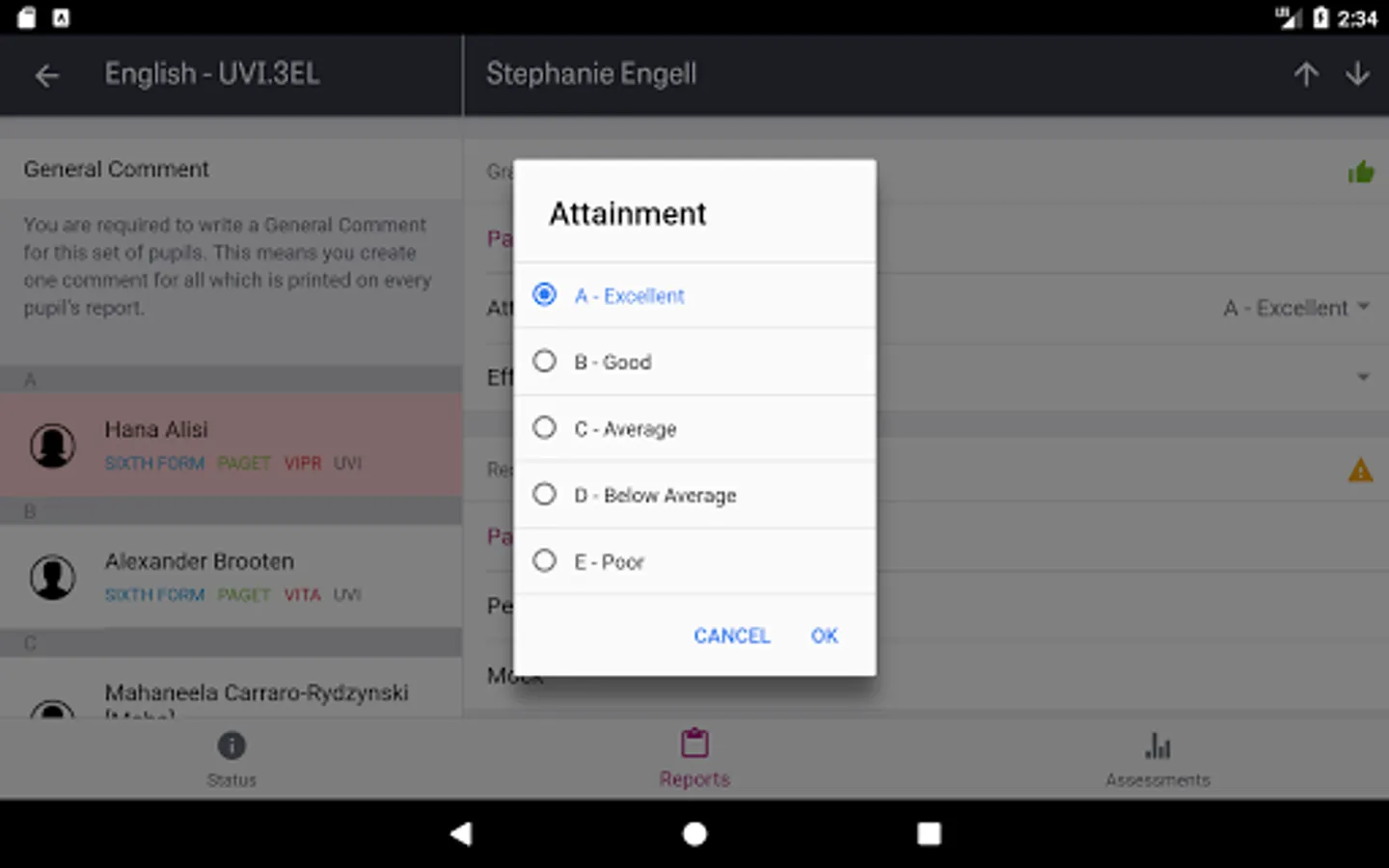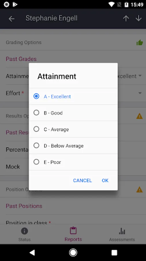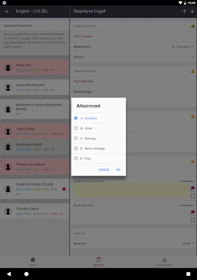 View each student’s past grades, results, options, comments and full reports – useful for quickly commenting on students’ personal progress.