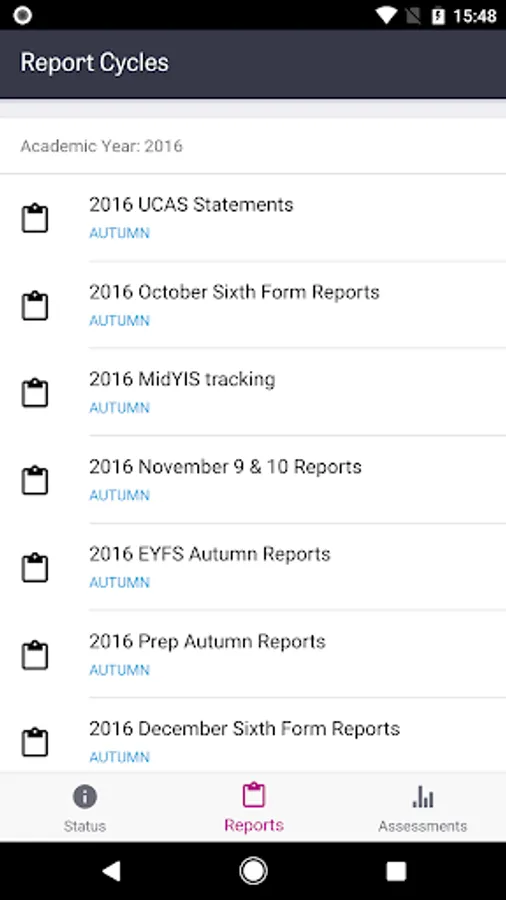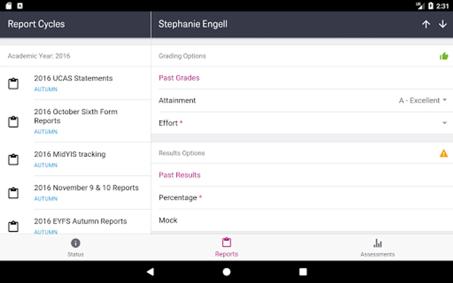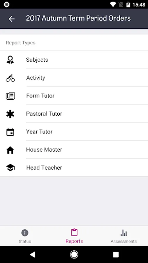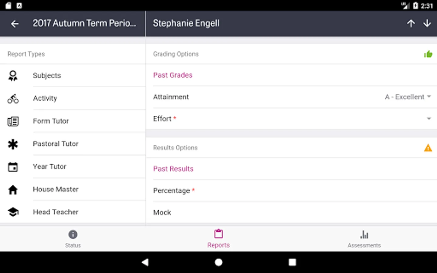 The Reports page displays all active reporting cycles, for example: End of Term Reports. Tapping on each reporting cycle gives the teacher a list of Report Types relevant to that cycle, as well as any associated with their particular role, such as Year Tutor.