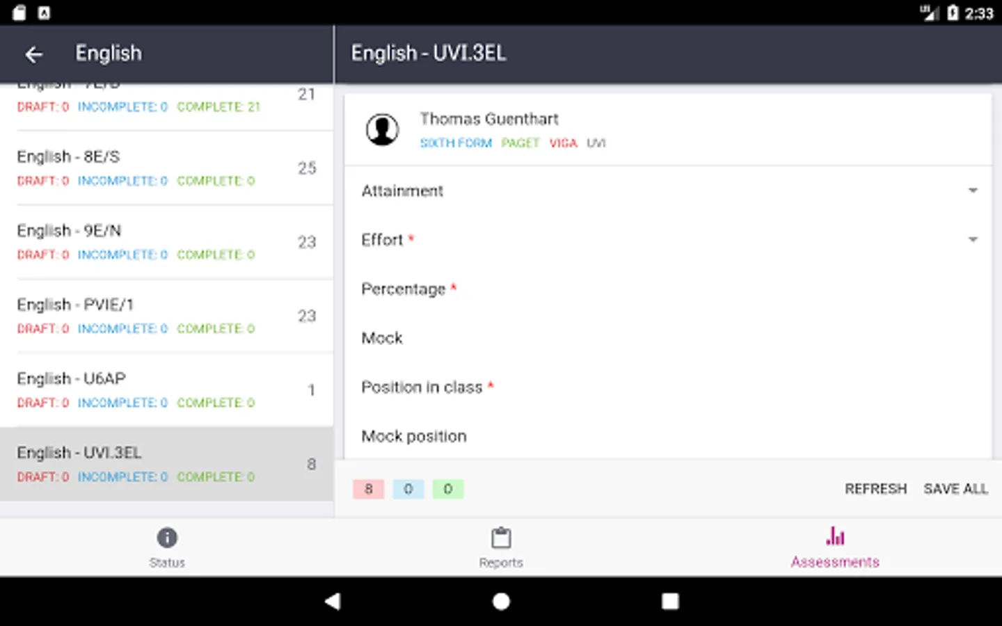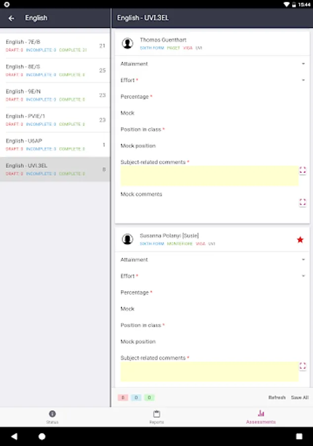 The Assessments page has the same navigation as the Reports page, all the way to individual students’ pages. Each student’s assessment data can be entered directly in the Students page. A footer indicating student totals is displayed, along with buttons to mark all and save all student assessment data.