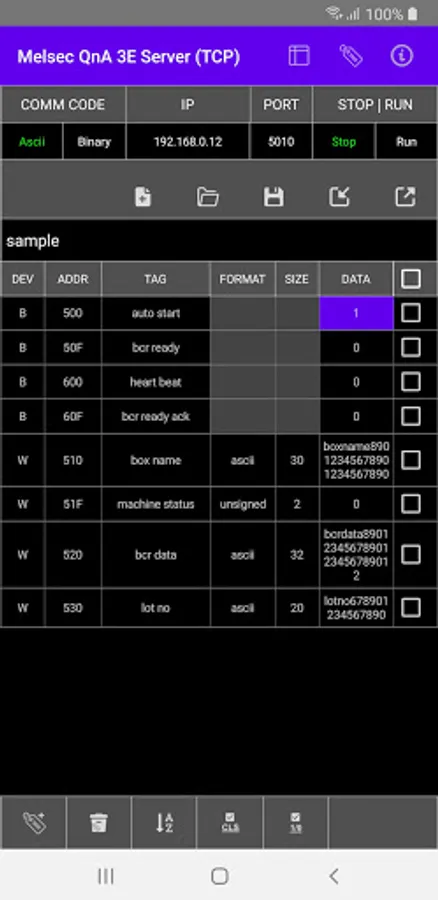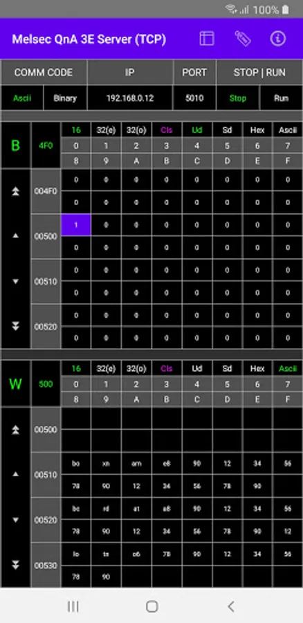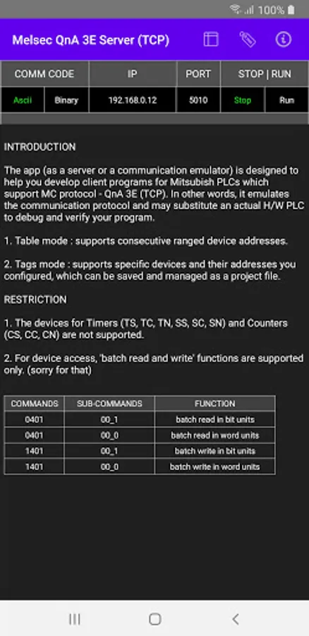 The app (as a server or a communication emulator) is designed to help you develop client software for Mitsubishi PLCs which support MC protocol - QnA 3E (TCP). In other words, it emulates the communication protocol and may be substituted for an actual H/W PLC to debug and verify your program.