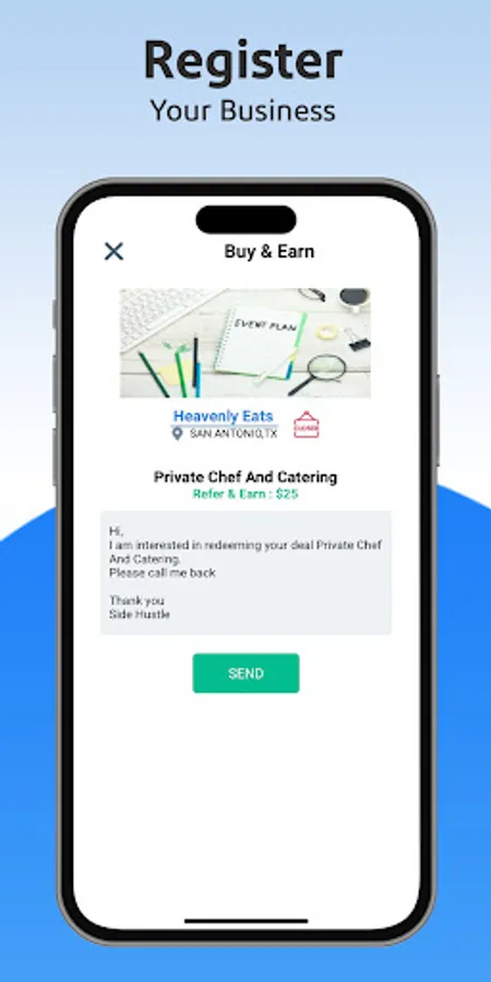 TURN YOUR FREE TIME INTO EXTRA CASH. The Side Hustle app enables anyone to make money from home by promoting businesses you love and it’s such an easy way to make money. Find a local or national business, select an offer find friends and family who would love to purchase products or services, or refer yourself and get paid for your efforts!