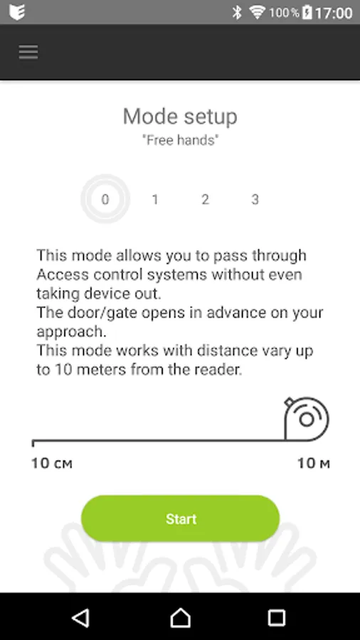 "Free hands" — no need to bring your phone close. Reader gets Access within 10 meters range or closer as you appear, even if phone is in your pocket.