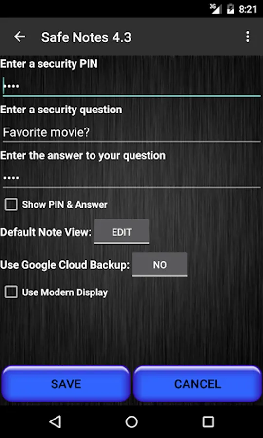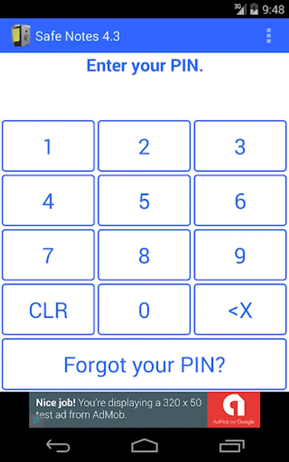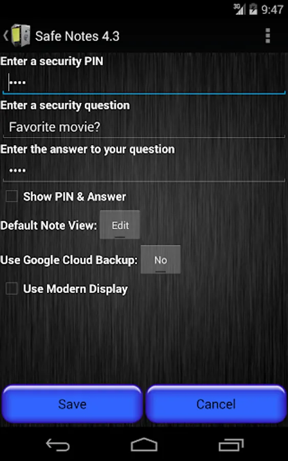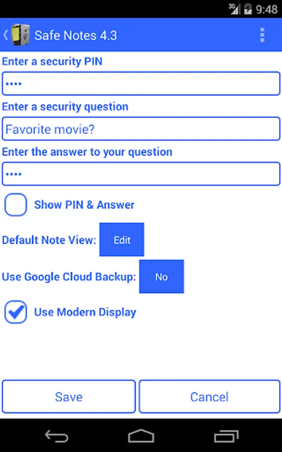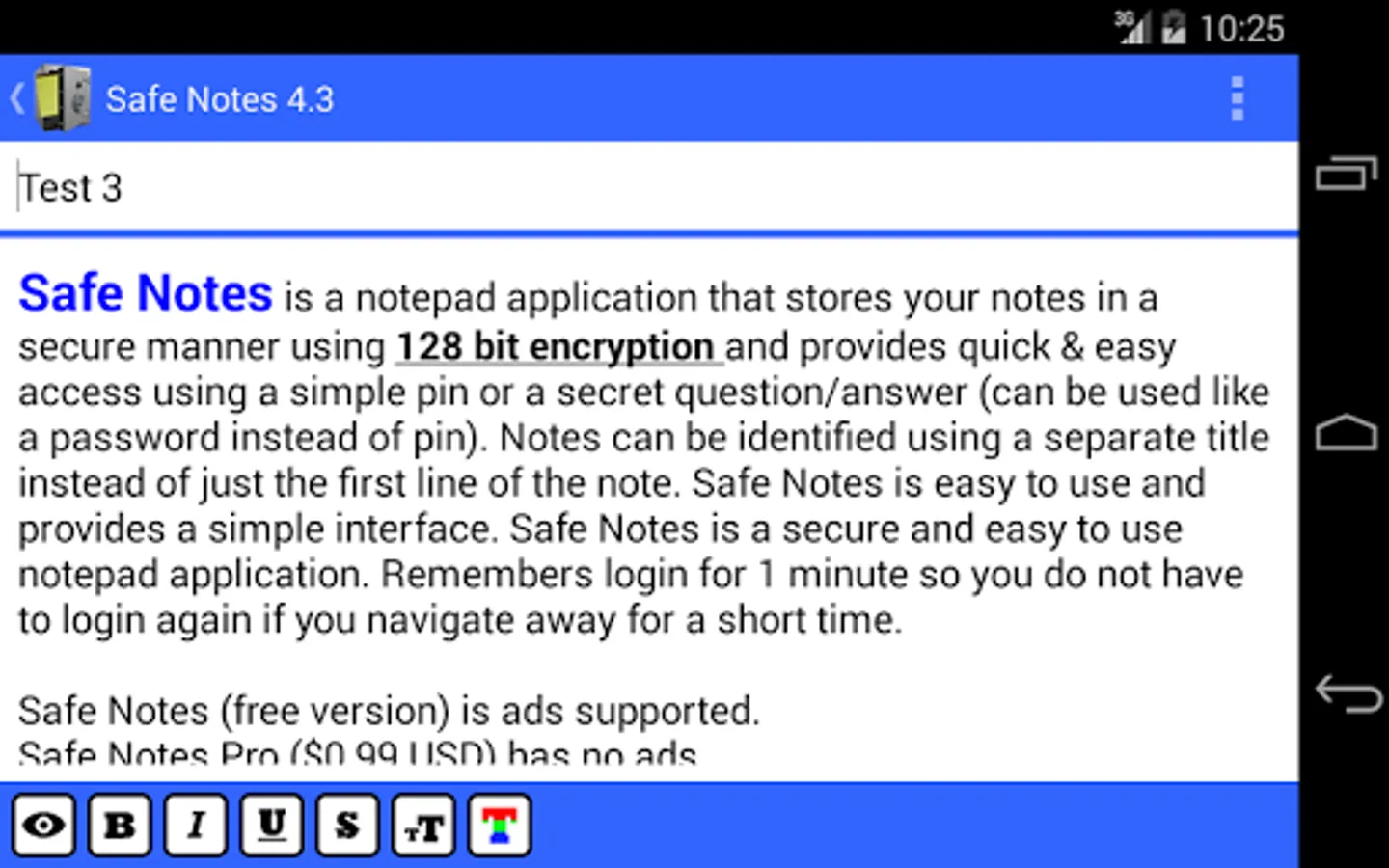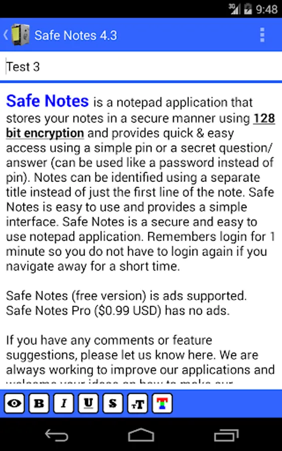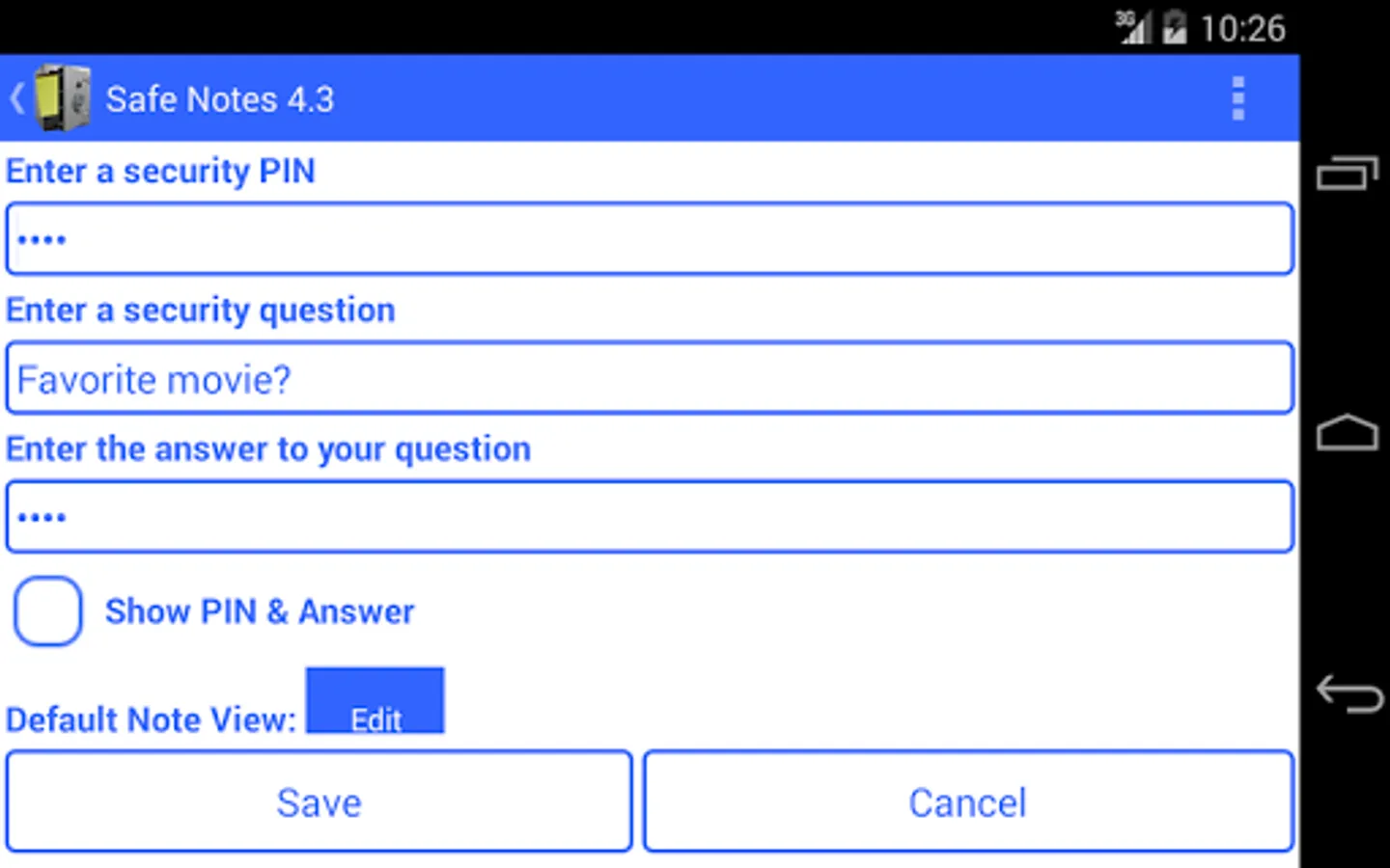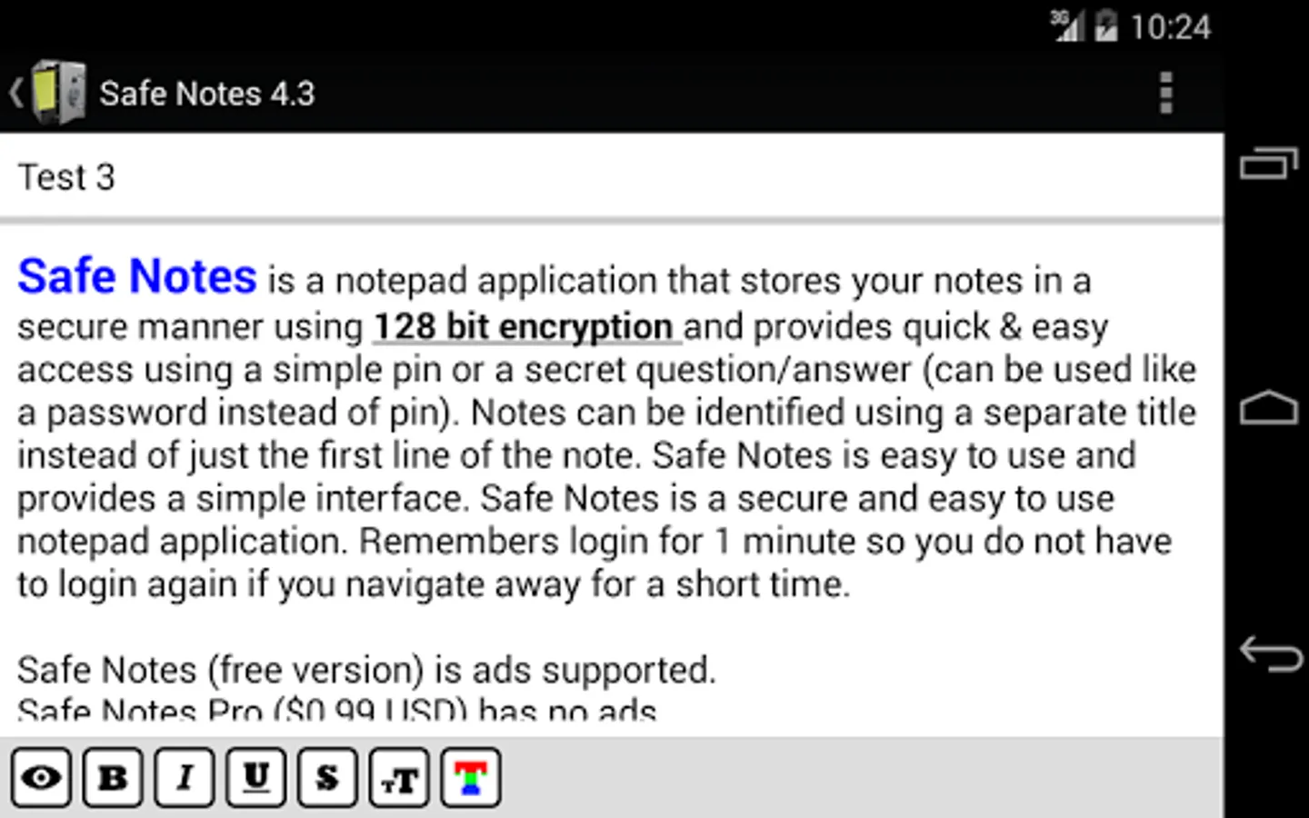 Safe Notes is a notepad application that stores your notes in a secure manner using 128 bit encryption and provides quick & easy access using a simple pin number or a secret question/answer (can be used like a password instead of pin). Notes can be identified using a separate title instead of just the first line of the note. Safe Notes stores all your data on the device instead of uploading your personal information to the internet. Safe Notes is easy to use and provides a simple interface. Safe Notes is a secure and easy to use notepad application.