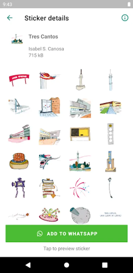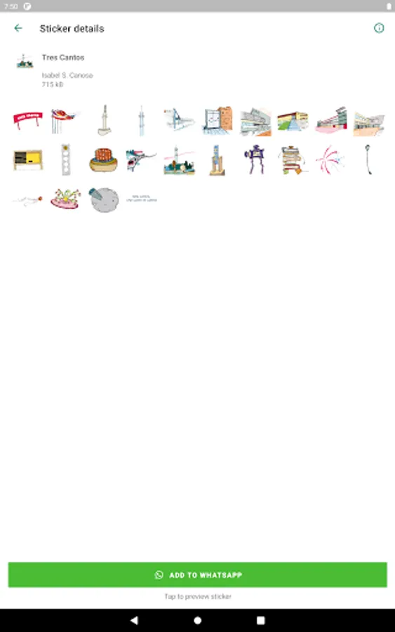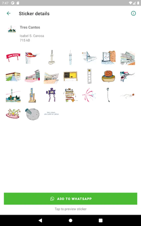 "Tres Cantos, a fairytale city" is an illustrated book. With this app you can install illustrations of places, characters, and surroundings of Cati Cantos, the protagonist of the story, to use them as stickers on your WhatsApp.