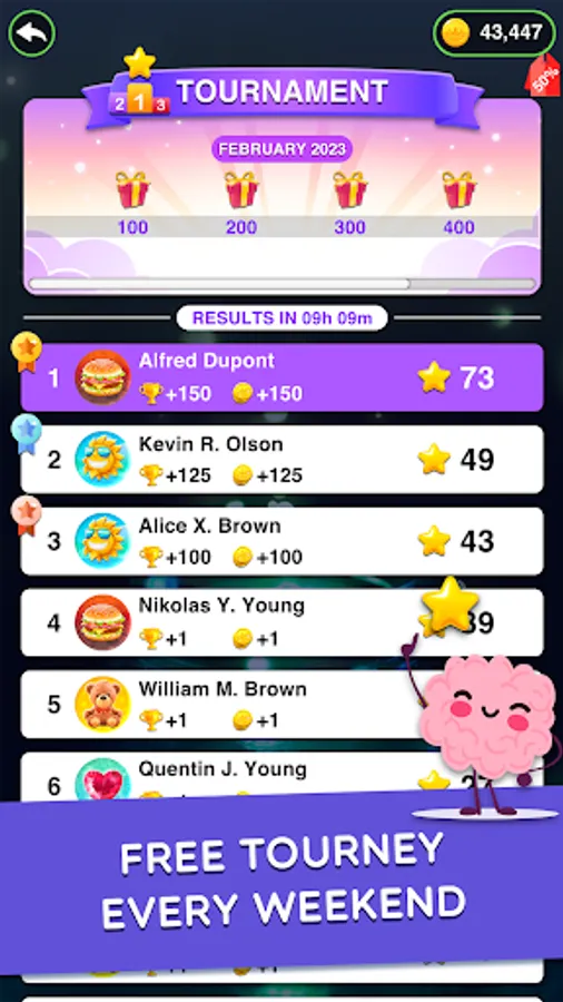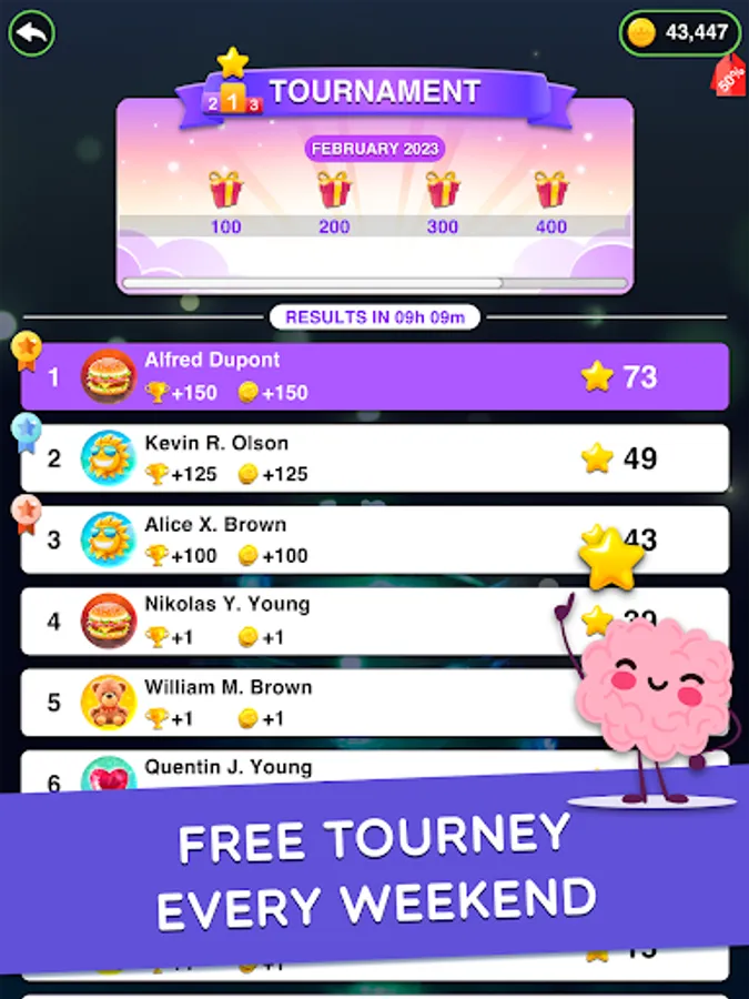 β€ FREE TOURNAMENTS. Find every word to score a maximum of stars every weekend. Earn your spot on the highest places of the rankings and get rewards.