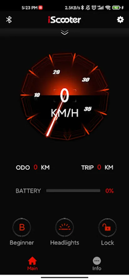 On the "Main" page,you can see vehicle speed, battery current,you can also lock and unlock your vehicle,select gear mode and control the light .