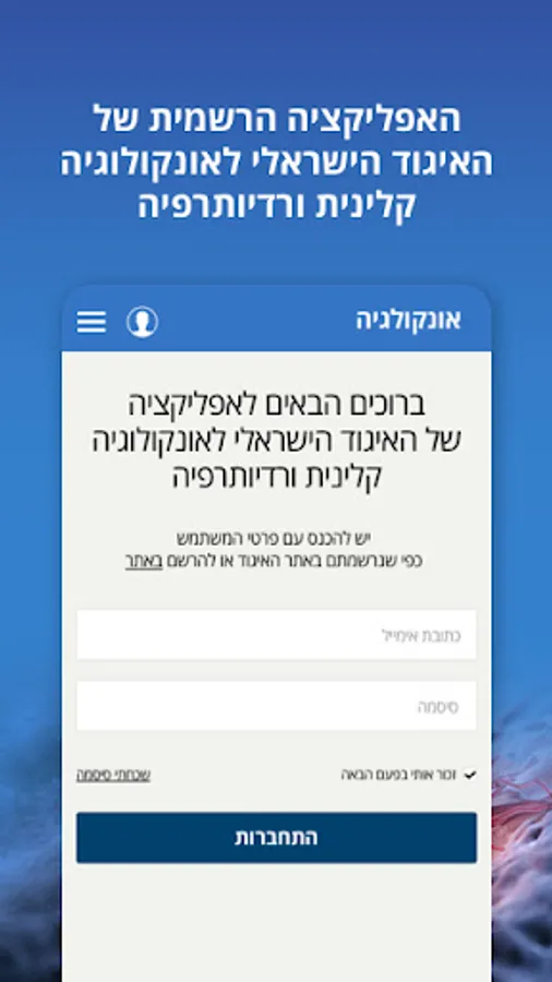 The official application of the Israeli Association of Clinical Oncology and Radiotherapy, for members of the association, oncologists only.
