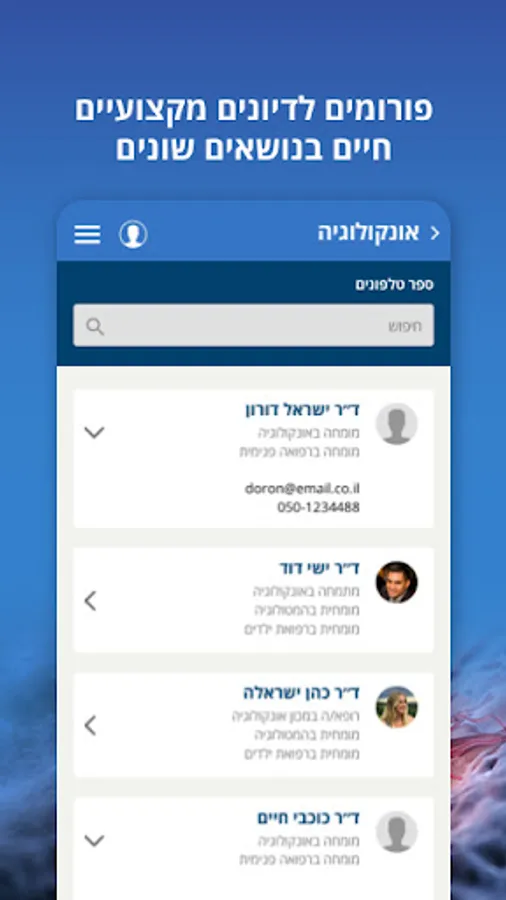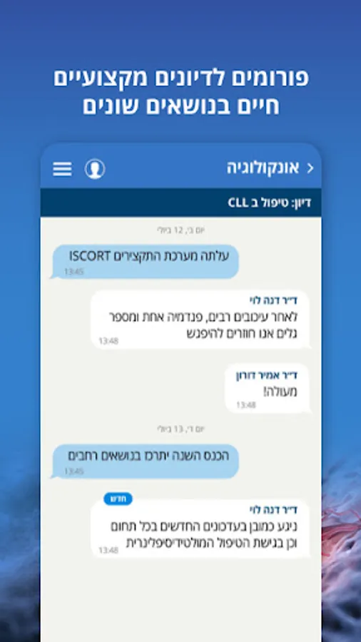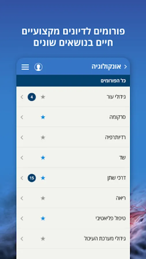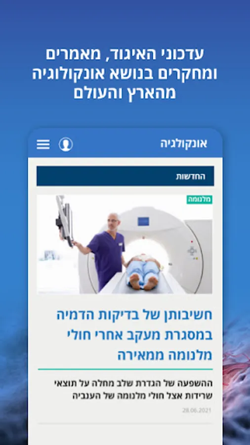 Association updates, articles and research on oncology from Israel and the world, conference updates and announcements from all departments, forums for live professional discussions on various topics