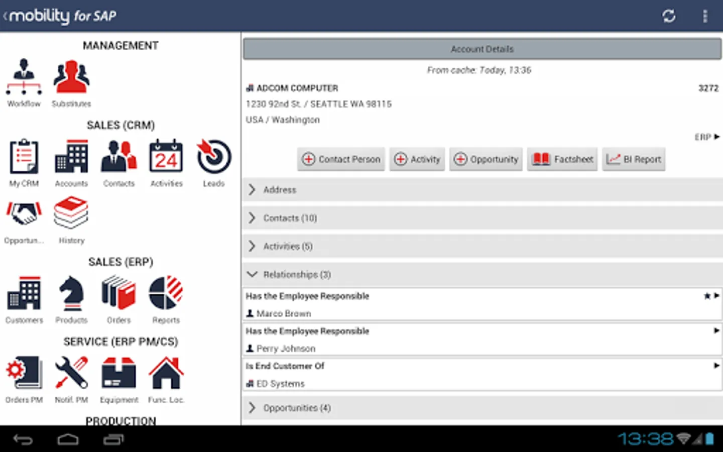 • Sales (such as sales data of your customers from SD, visit reports, order entry, recording of complaints, price and availability check,…)