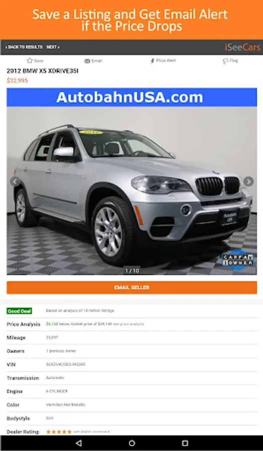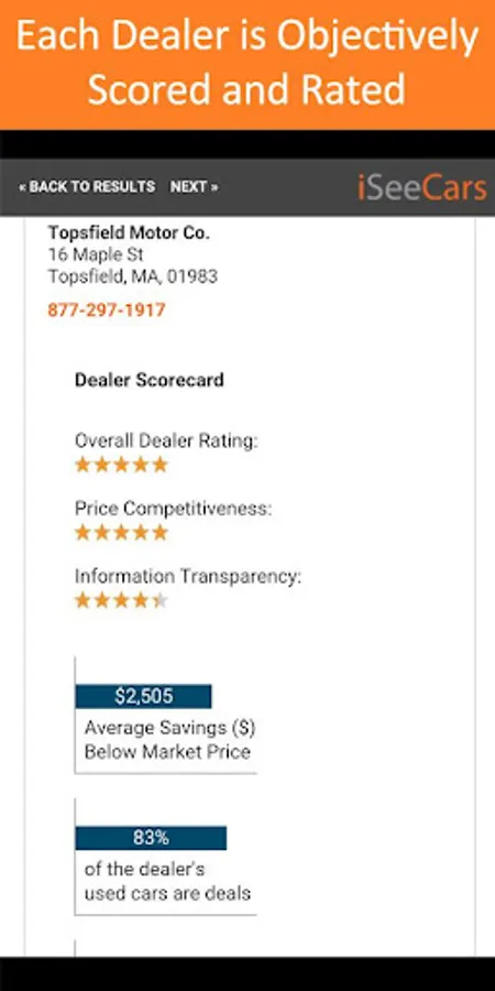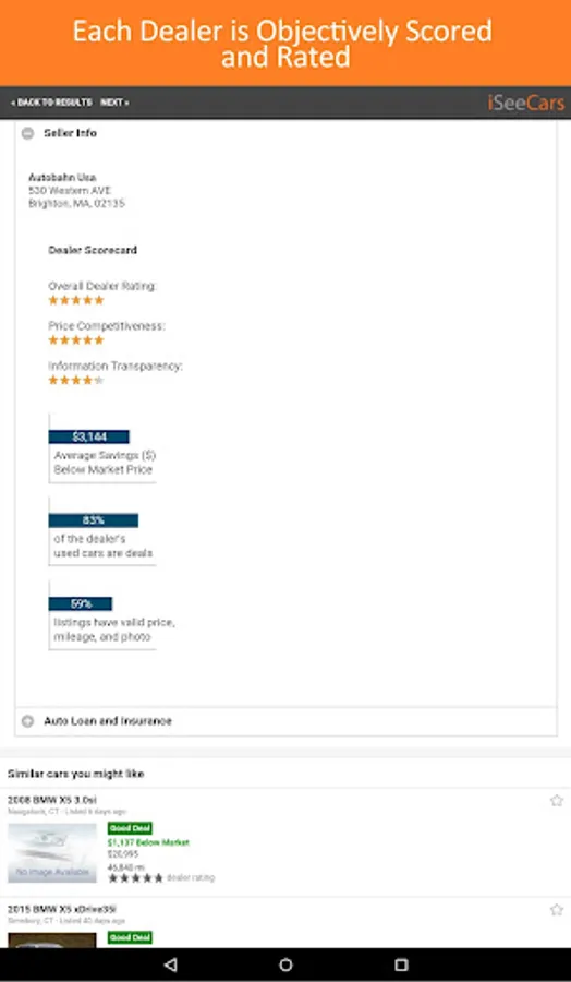 While finding the perfect used car is great, it would be even better if the car was being sold by a trustworthy car dealer, not one that's out to scam the consumer. We use a number of signals to determine how price competitive a dealer is, how transparent the dealer is in disclosing information about the car, and how responsive it is in getting back to shoppers' inquiries and questions.
