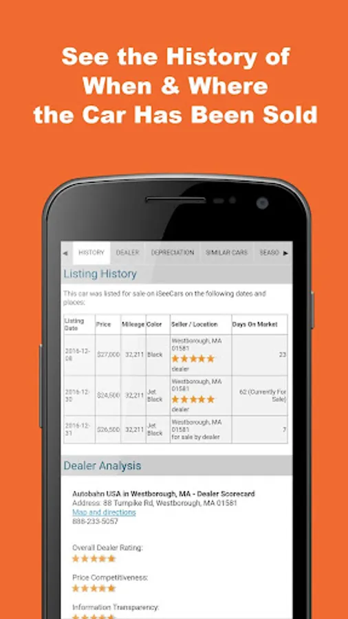 See a history of where and when the used car had been sold along with the prices and how long the car was on the market.