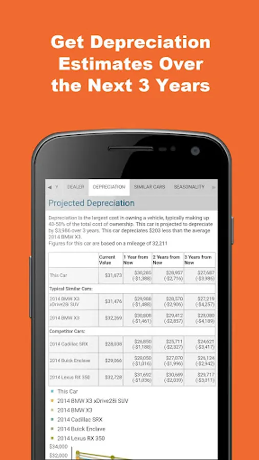 Get an estimate of how much the used car will depreciate over 1, 2 and 3 years and in comparison with similar and competitor cars.