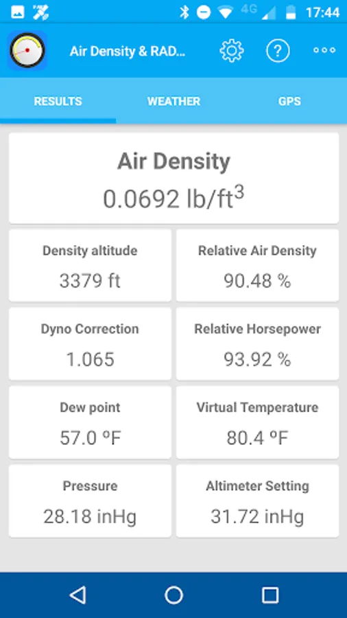 - Results: In this tab, the calculated air density, density altitude, relative air density (RAD), relative horsepower, dyno correction factor, dew point, virtual temperature, altitude setting and real pressure are shown.
