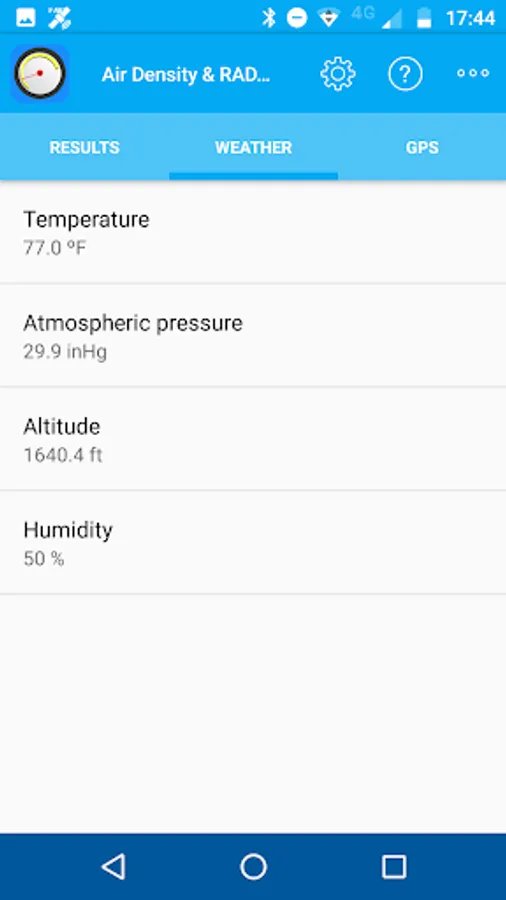 - Weather: you can set the values for current temperature, altitude, pressure and humidity. The values of this screen can be manually set or can be loaded by the application reading the data from the nearest weather station (from the GPS tab).
