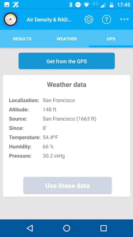 In order to get the weather values, the application can use the GPS to obtain the position and altitude, and the network connection to get the temperature, pressure and humidity from the nearest weather station. Nevertheless, the application can run without GPS and internet connection, in this case, the user has to give the altitude and weather data.