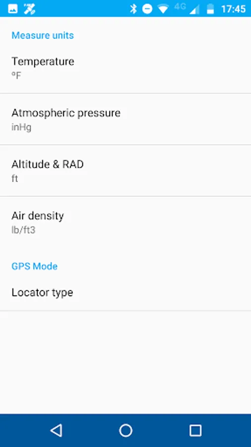 The application can manage different measure units: meters and feet for altitude and density altitude; ºC and ºF for temperatures; mb, hPa, inHg, mmHg for pressure; kg/m3, lb/ft3, lb/gal (US) for air density.