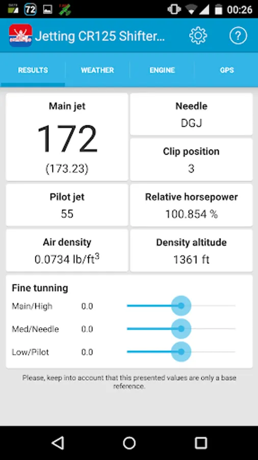 - Results: in this tab, the recommended setup is shown. It's calculated depending on the weather conditions, the engine and track configuration given in the other tabs. For the carb config, the following values are given: main jet, needle type and clip position and pilot jet. Under the recommended main jet, the calculated real value with decimals is shown. Besides this information, the air density, density altitude and relative horsepower are shown too. In addition, this tab lets do a fine tunning adjustment for the main (high), needle (mid) and pilot (low) circuits to adapt to your concrete motor and carburetor.