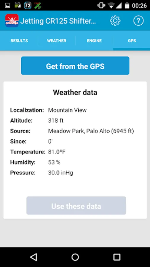 In order to get the weather values, the application can use the GPS to obtain the position and altitude, and the network connection to get the temperature, pressure and humidity from the nearest weather station. Nevertheless, the application can run without GPS and internet connection, in this case, the user has to give the weather data.