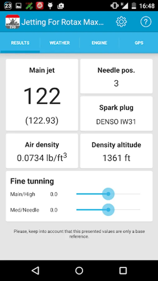 - Results: in this tab, the recommended main jet, needle position, air density and spark plug type values are shown. These data are calculated depending on the weather conditions and the configuration given in the other tabs. In addition, this tab lets to make a fine tuning adjustment to adapt to your concrete motor and carburetor.