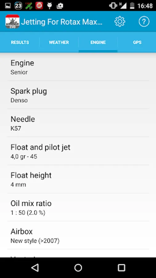 This app provides, using weather conditions and your engine configuration, a recommendation about jetting and spark plug to use for karts with Rotax Max EVO (Senior, Minimax, Micromax, Supermax, DD2 or Junior), which use a Dellorto VHSB 34 XS carb to get the best performance.