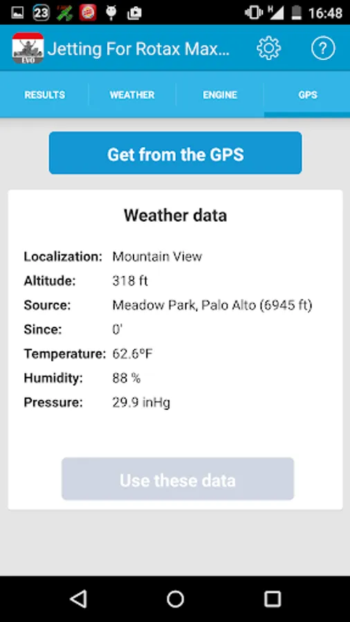 In order to get the weather values, the application can use the GPS to obtain the position and altitude, and the network connection to get the temperature, pressure and humidity from the nearest weather station. Nevertheless, the application can run without GPS and internet connection, in this case, the user has to enter the weather data.