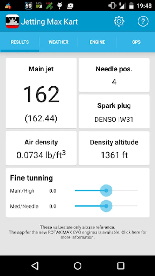 This app provides, using weather conditions and your engine configuration, a recommendation about jetting and spark plug to use for karts with Rotax Max Senior, Minimax, Micromax, Supermax, DD2 or Junior, which use a Dellorto VHSB 34 carb to get the best performance.